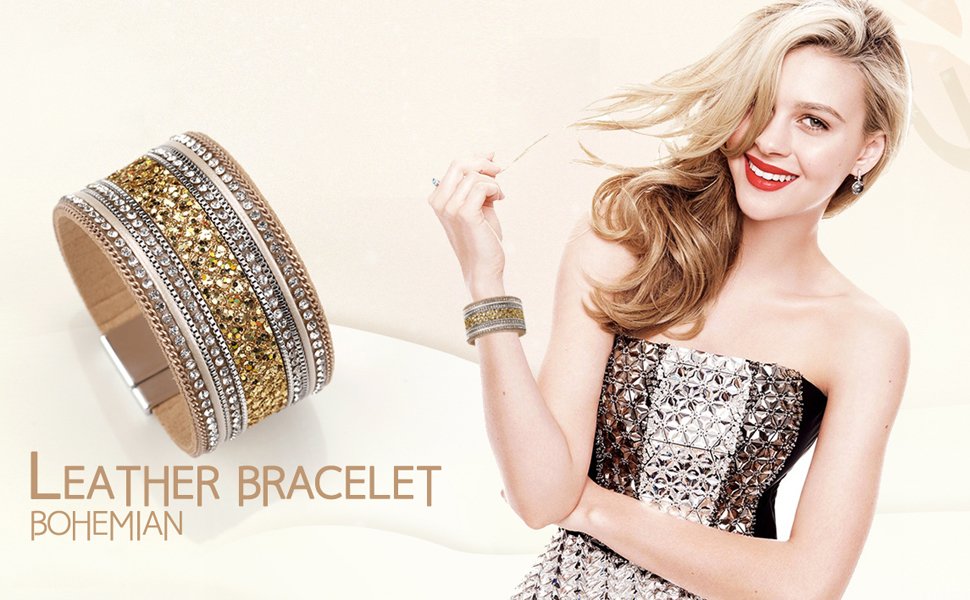 - This women leather bracelet features multilayer leather cord and combination with rhinestones and natural stone. It is made of a strong high-quality alloy magnetic clasp so as to easy wear and take off.
